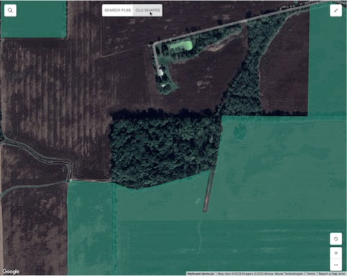 Toggling on CLU Shapes shows a ghosted layer that is clickable and editable, which allows users to utilize FSA CLU boundaries for their fields easily.